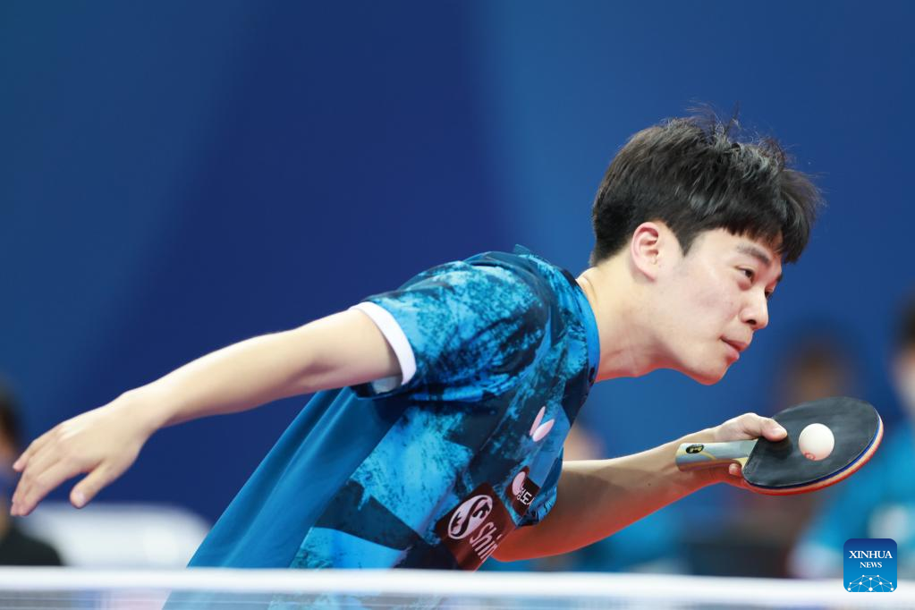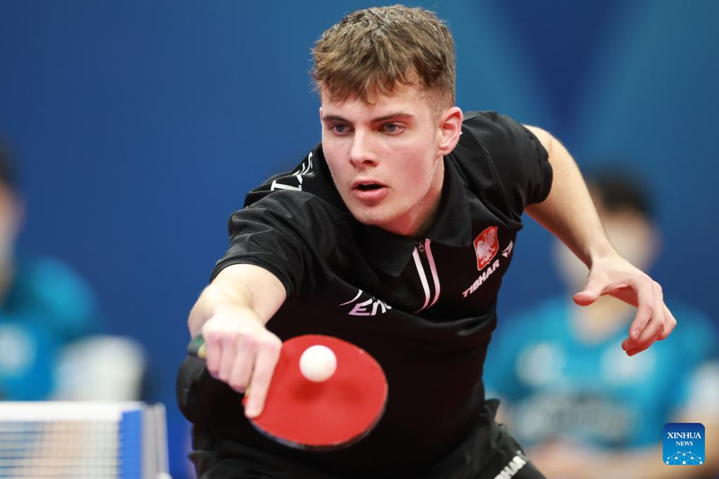 Milosz Redzimski of Poland hits a return during the men's teams round of 16 match against Jang Woojin of South Korea at the 2022 ITTF World Team Table Tennis Championships Finals in Chengdu, southwest China's Sichuan Province, Oct. 5, 2022. (Xinhua/Liu Xu)