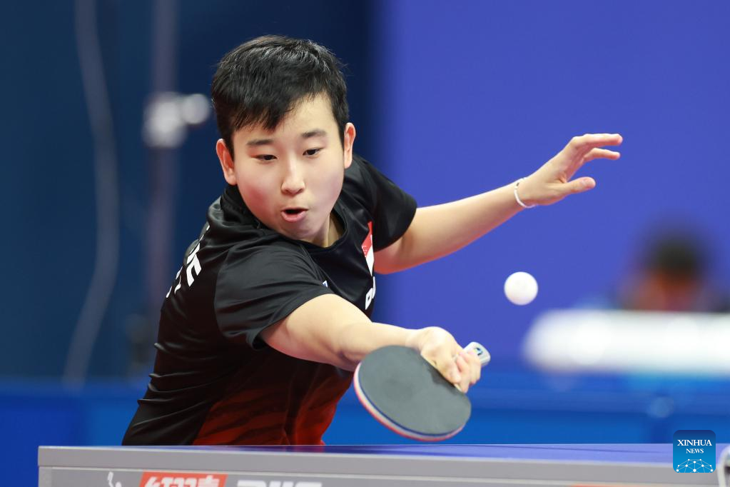 Zhou Jingyi of Singapore hits a return during the women's teams round of 16 match against Hana Matelova of the Czech Republic at the 2022 ITTF World Team Table Tennis Championships Finals in Chengdu, southwest China's Sichuan Province, Oct. 5, 2022. (Xinhua/Liu Xu)