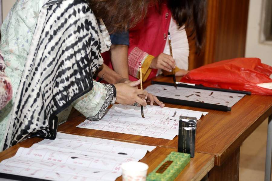 Students learn Chinese calligraphy during a Chinese language class in Islamabad, capital of Pakistan, on Oct. 5, 2022. (Xinhua/Ahmad Kamal)