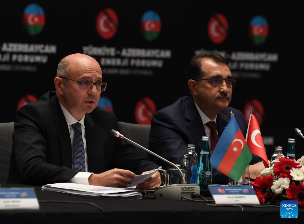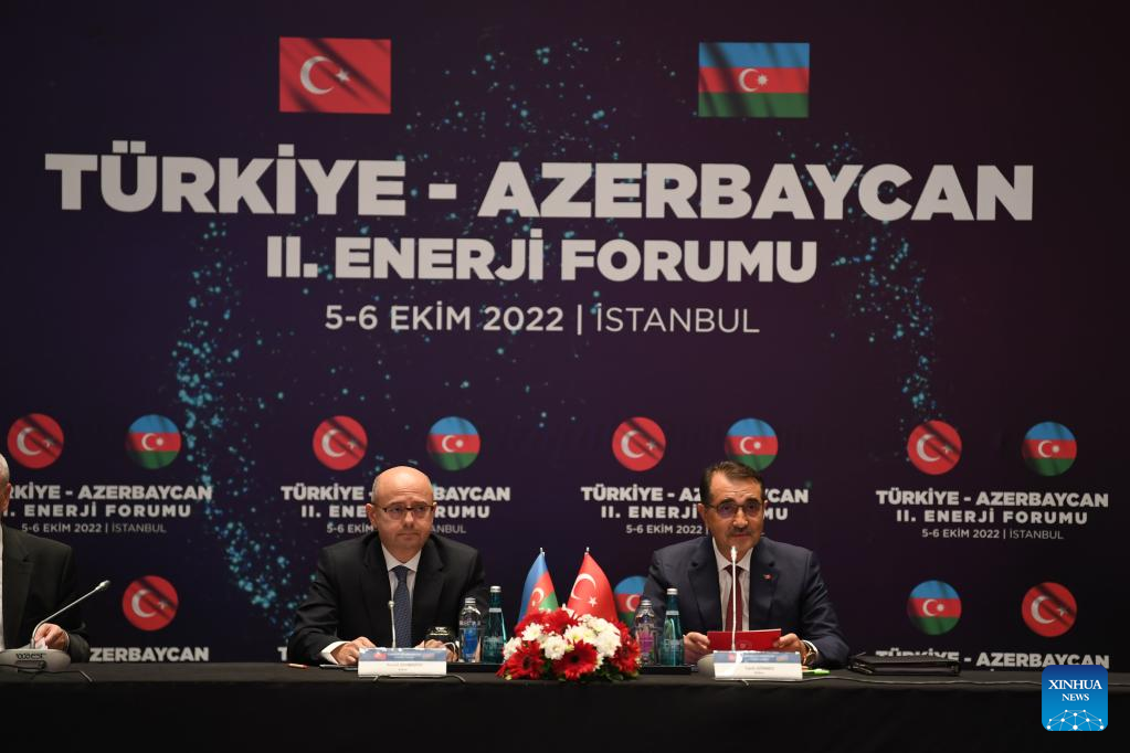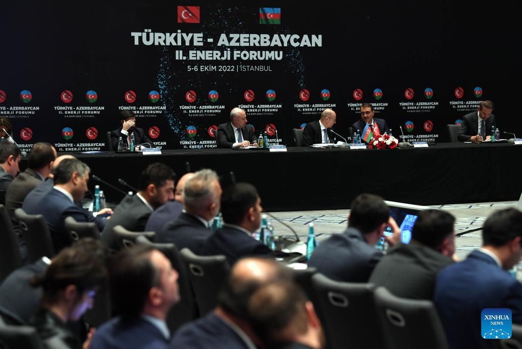 Photo taken on Oct. 6, 2022 shows a view of the 2nd Azerbaijan-Türkiye Energy Forum in Istanbul, Türkiye. With bilateral accords soon to be signed, energy cooperation between Türkiye and Azerbaijan will reach a higher level, Turkish Minister of Energy and Natural Resources Fatih Donmez said on Thursday. (Xinhua/Shadati)
