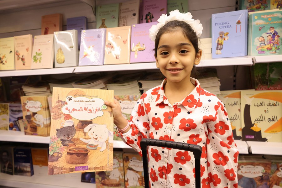 A Saudi girl holds a Chinese children's book translated into Arabic at the China Intercontinental Press's booth during the Riyadh International Book Fair 2022 in Riyadh, capital of Saudi Arabia, on Oct. 3, 2022. (Xinhua/Wang Haizhou)