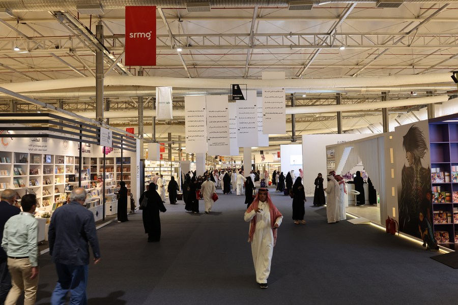 Photo taken on Oct.3, 2022 shows visitors walking at an exhibition hall of the Riyadh International Book Fair 2022 in Riyadh, Saudi Arabia. (Xinhua/Wang Haizhou)