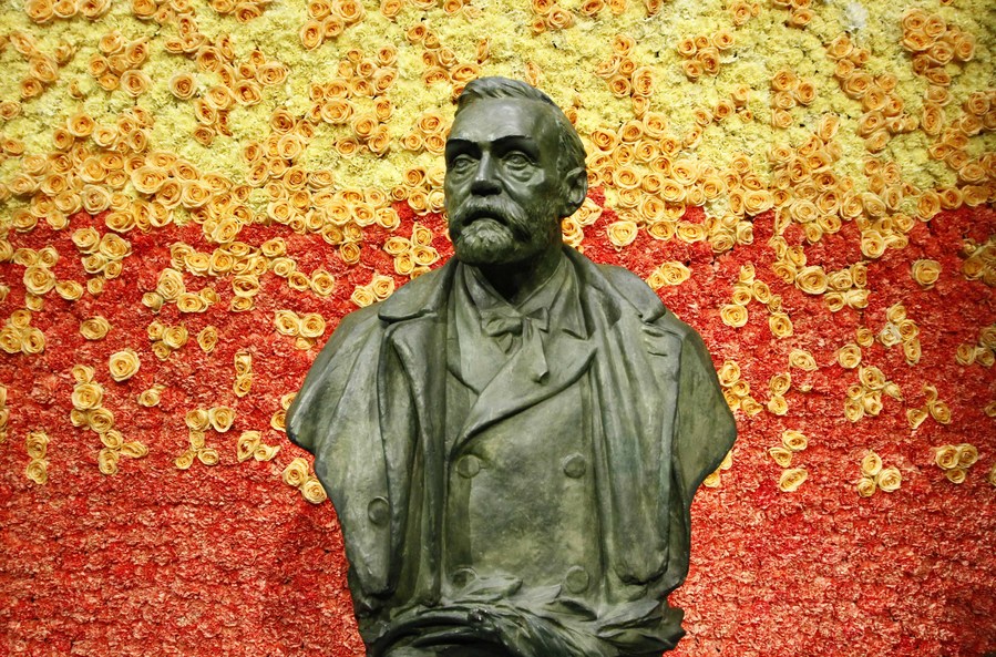 A statue of Nobel is decorated with flower wall as backdrop for the Nobel Prize awarding ceremony at Stockholm Concert Hall in Stockholm, capital of Sweden, Dec. 10, 2015. (Xinhua/Ye Pingfan)(azp)