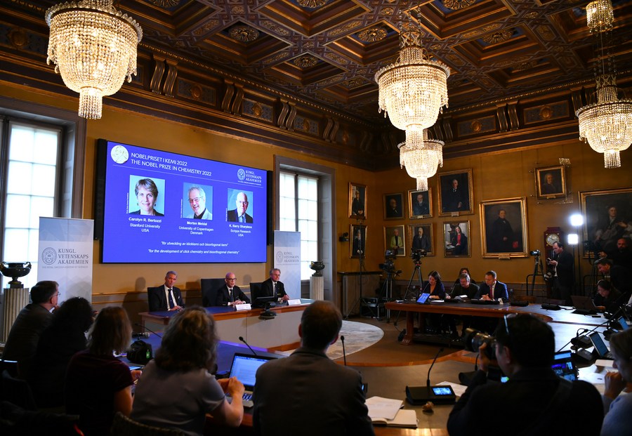 The announcement of the 2022 Nobel Prize in Chemistry is held in Stockholm, Sweden, Oct. 5, 2022. (Xinhua/Ren Pengfei)