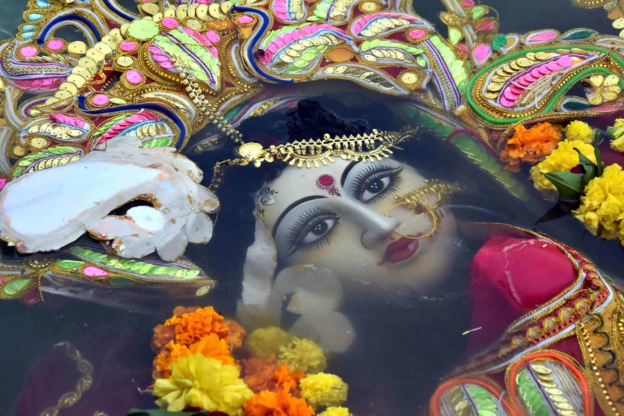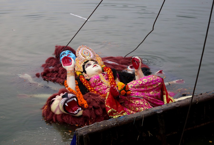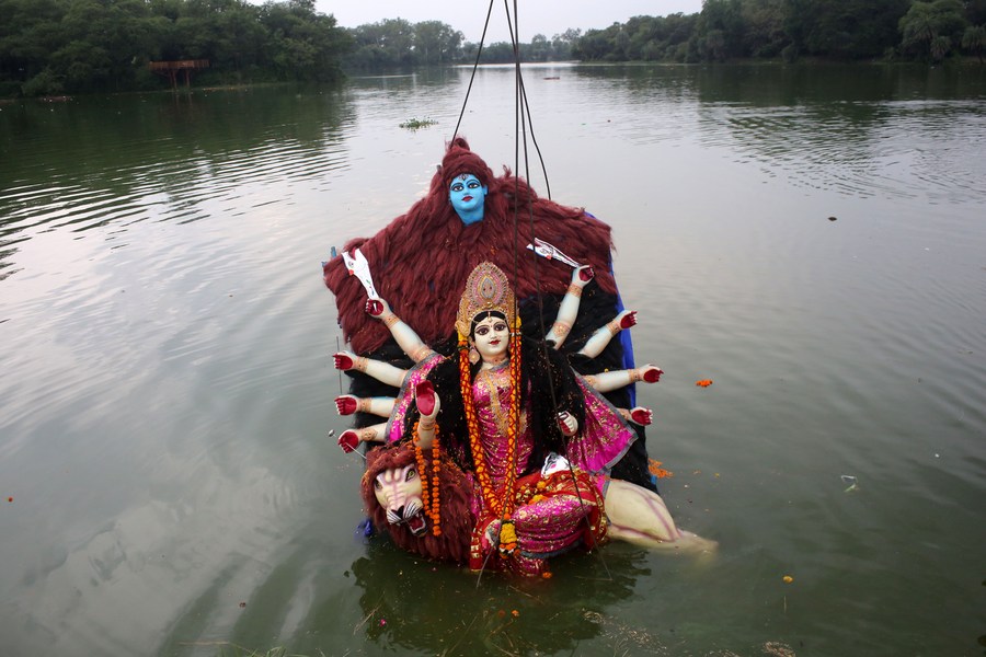 An idol of Goddess Durga is being immersed in a water body at the end of the Hindu festival Durga Puja in Bhopal, the capital of India's Madhya Pradesh state, Oct. 6, 2022. (Xinhua stringer)