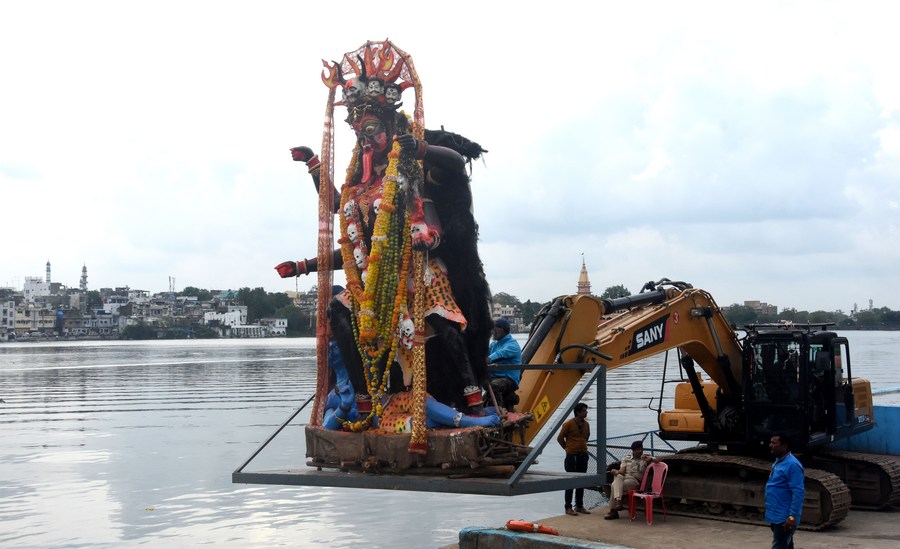 An idol of Goddess Kali is being lifted by a crane for immersion in a water body at the end of the Hindu festival Durga Puja in Bhopal, the capital of India's Madhya Pradesh state, Oct. 6, 2022. (Xinhua stringer)