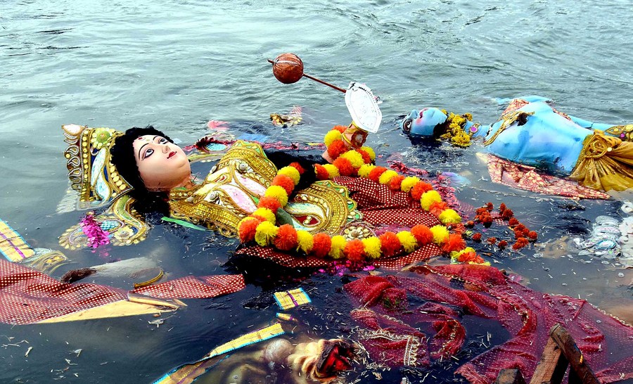 An idol of Goddess Durga is being immersed in a water body at the end of the Hindu festival Durga Puja in Bhopal, the capital of India's Madhya Pradesh state, Oct. 6, 2022. (Xinhua stringer)■