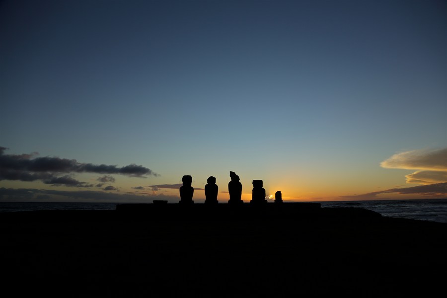 Photo taken on July 7, 2018 shows a view of Moai stone statues at sunset in Easter island of Chile. (Xinhua/Wang Pei)