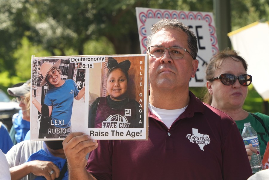 People, including more than a dozen of the Uvalde school shooting victims' family members, participate in a demonstration to seek age raise for AR-15 sales in Austin, Texas, the United States, Aug. 27, 2022. (Photo by Bo Lee/Xinhua)