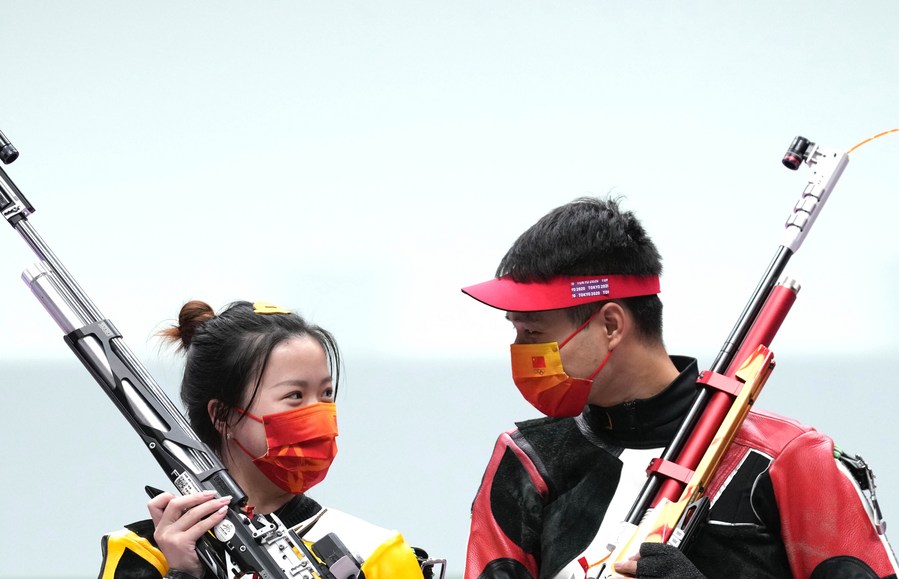 Yang Qian (L) and Yang Haoran of China react after winning the 10m air rifle mixed team final between China and the United States at Tokyo 2020 Olympic Games in Tokyo, Japan, July 27, 2021. (Xinhua/Ju Huanzong)