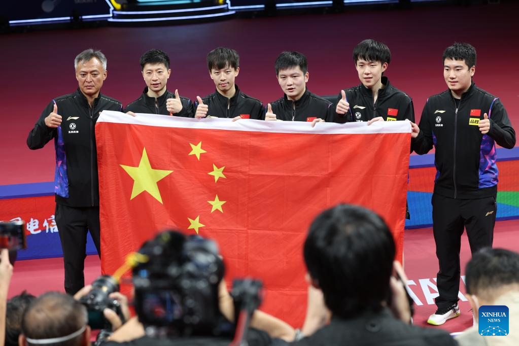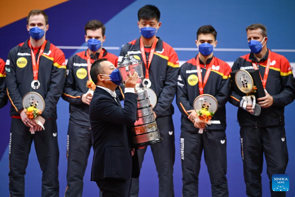 CHENGDU, China, Oct. 9 (Xinhua) -- China made short work of their German counterparts 3-0 in the men's final here on Sunday at the World Team Table Tennis Championships and lifted the Swaythling Cup for the tenth time in a row and a record 22 times overall.