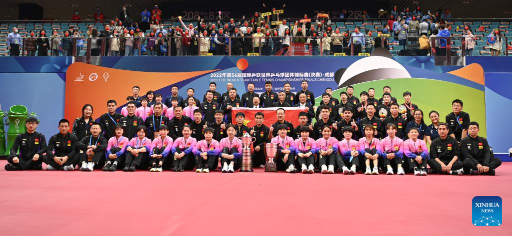 Members of China pose with trophy during the awarding ceremony after the men's teams final match against Germany at the 2022 ITTF World Team Table Tennis Championships Finals in Chengdu, southwest China's Sichuan Province, Oct. 9, 2022. (Xinhua/Jiang Hongjing)