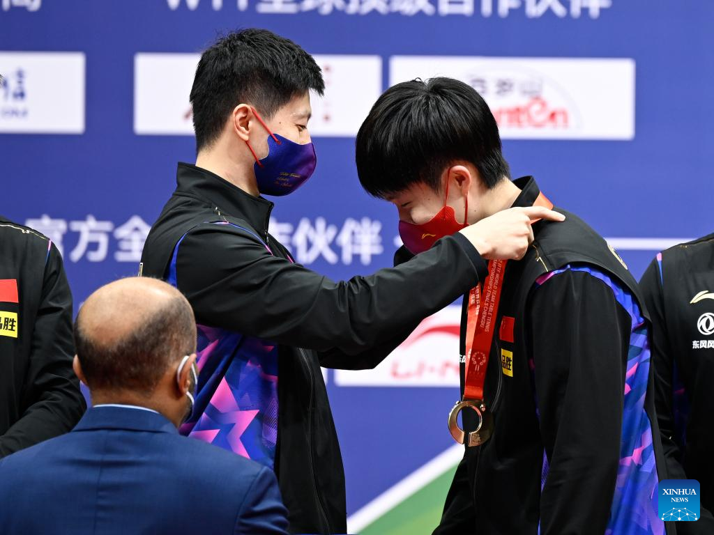 Ma Long (L) of China awards the medal to teammate Wang Chuqin during the awarding ceremony after the men's teams final match against Germany at the 2022 ITTF World Team Table Tennis Championships Finals in Chengdu, southwest China's Sichuan Province, Oct. 9, 2022. (Xinhua/Xu Bingjie)