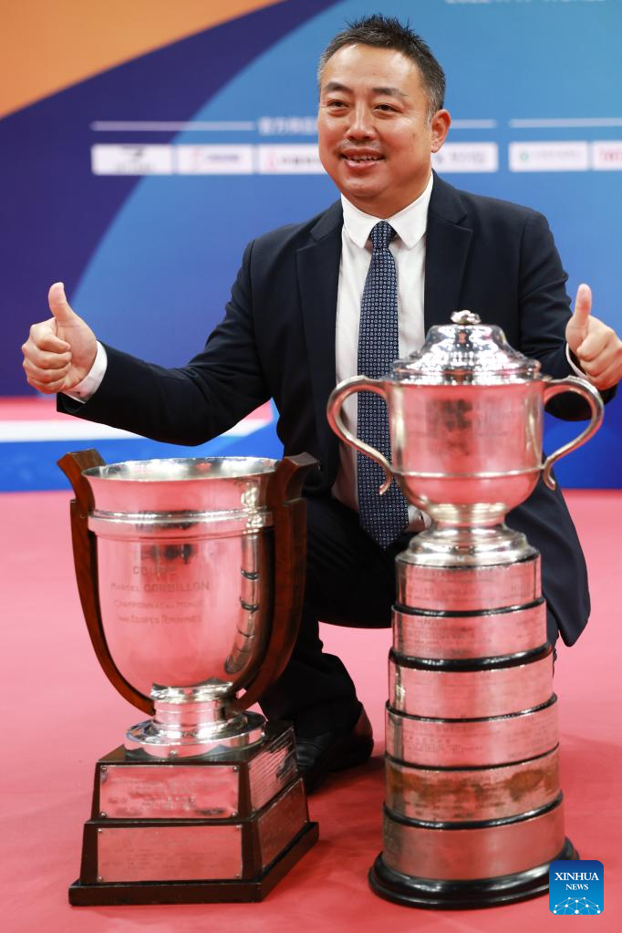 President of Chinese Table Tennis Association (CTTA) Liu Guoliang poses with trophies during the awarding ceremony after the men's teams final match at the 2022 ITTF World Team Table Tennis Championships Finals in Chengdu, southwest China's Sichuan Province, Oct. 9, 2022. (Xinhua/Liu Xu)