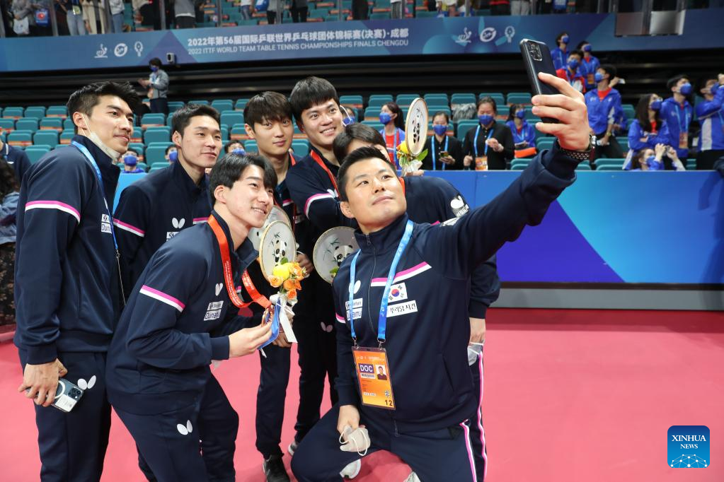 Members of South Korea take a selfie during the awarding ceremony after the men's teams final match against Germany at the 2022 ITTF World Team Table Tennis Championships Finals in Chengdu, southwest China's Sichuan Province, Oct. 9, 2022. (Xinhua/Jiang Hongjing)
