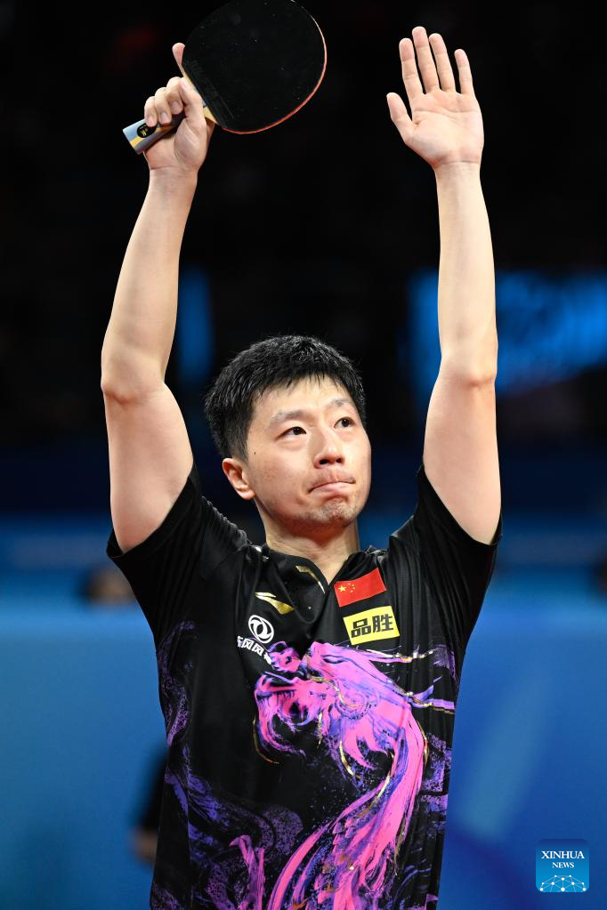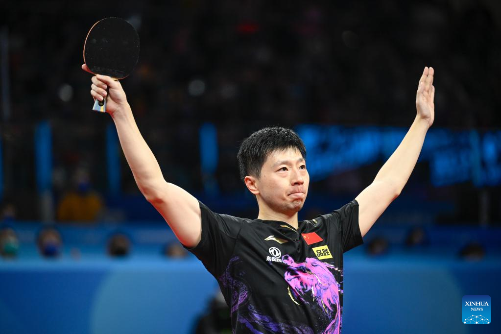 Ma Long of China celebrates after winning Qiu Dang of Germany during the men's teams final match at the 2022 ITTF World Team Table Tennis Championships Finals in Chengdu, southwest China's Sichuan Province, Oct. 9, 2022. (Xinhua/Liu Xu)