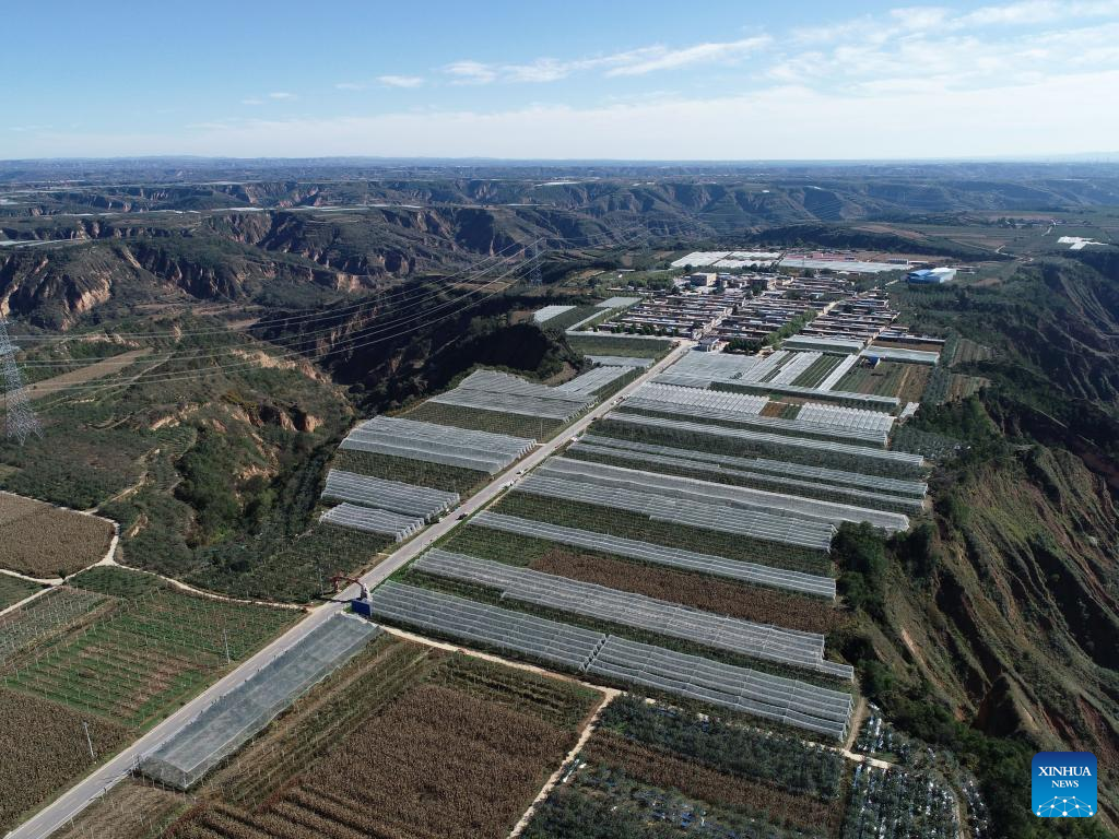Aerial photo taken on Oct. 10, 2022 shows an apple orchard in Yongxiang Town of Luochuan County, northwest China's Shaanxi Province. (Xinhua/Zhang Bowen)
