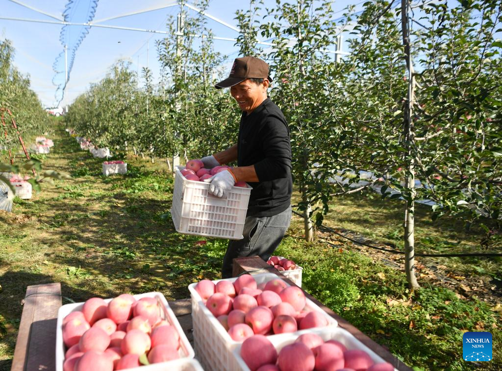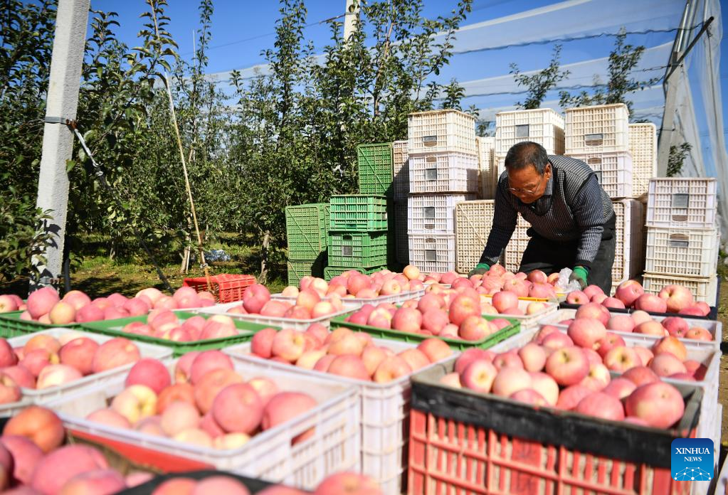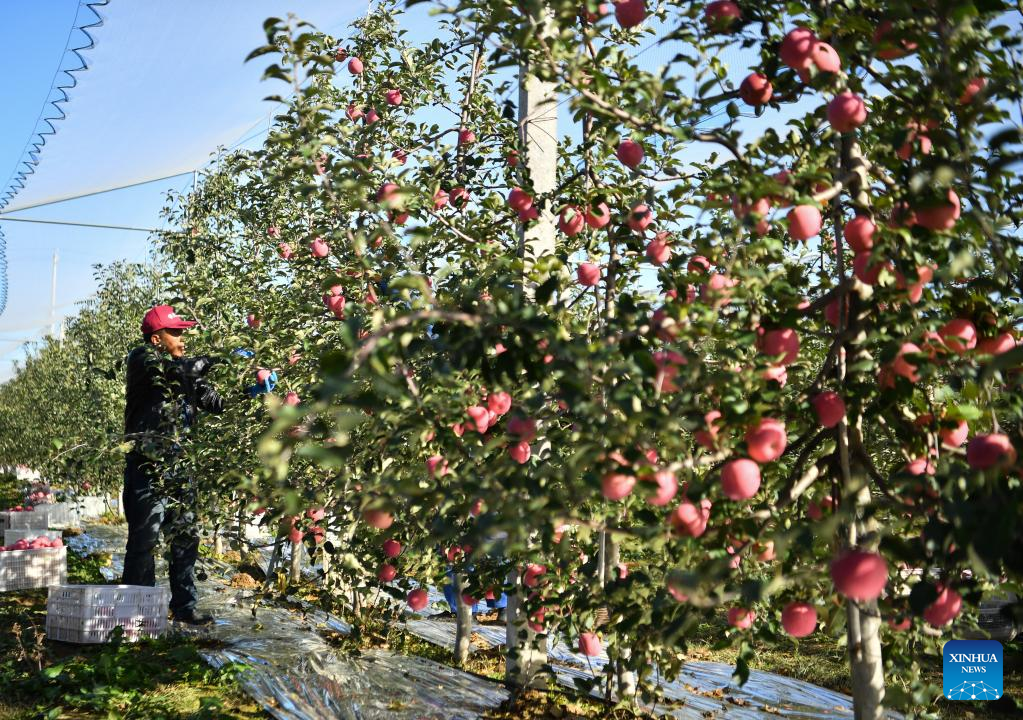 A farmer harvests apples at an orchard in Yongxiang Town of Luochuan County, northwest China's Shaanxi Province, Oct. 10, 2022. (Xinhua/Zhang Bowen)