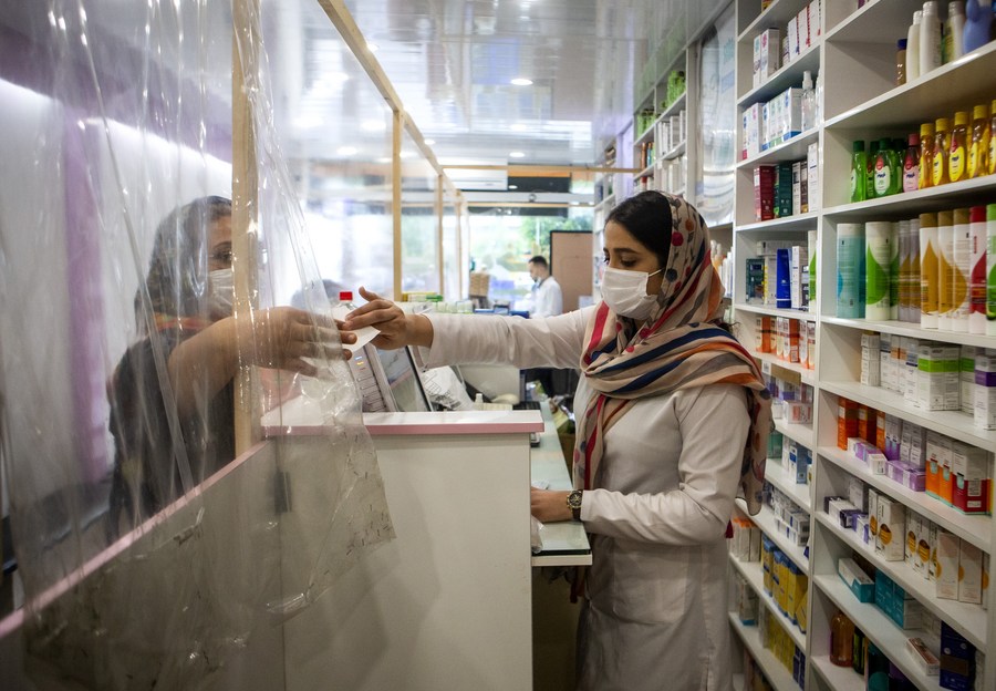 A staff member wearing a face mask works at a pharmacy in Tonekabon, Iran, on April 26, 2021. (Photo by Ahmad Halabisaz/Xinhua)