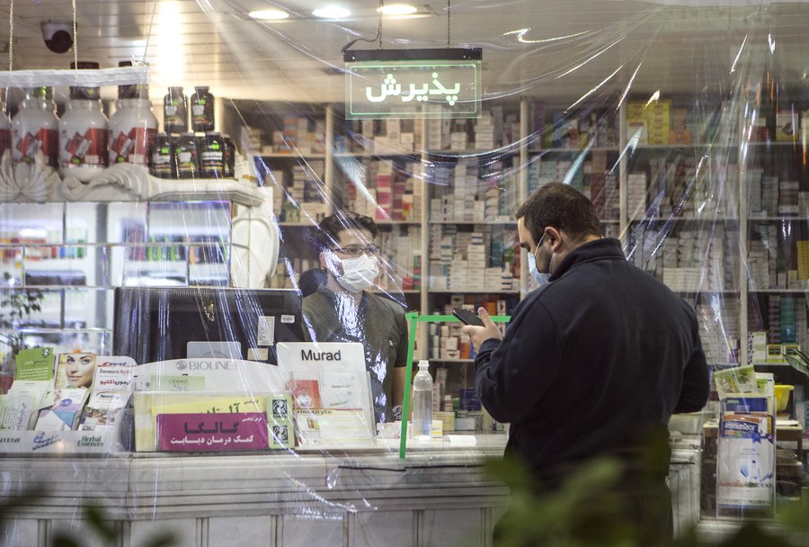 A seller wearing a face mask works at a pharmacy in Mashhad, Iran, Nov. 7, 2020. (Photo by Ahmad Halabisaz/Xinhua)