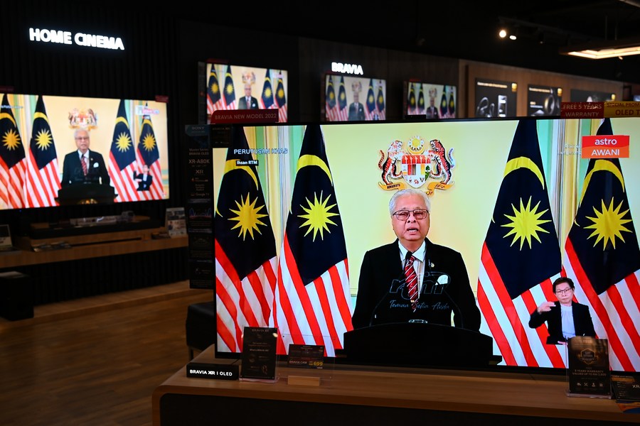 TV screens displayed at a local home appliance store show a televised speech by Malaysian Prime Minister Ismail Sabri Yaakob in Kuala Lumpur, Malaysia, Oct. 10, 2022. (Xinhua/Zhu Wei)