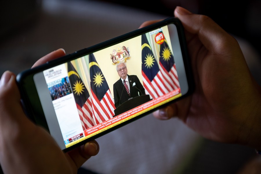 A man watches on his mobile phone a televised speech by Malaysian Prime Minister Ismail Sabri Yaakob in Kuala Lumpur, Malaysia, Oct. 10, 2022. (Photo by Chong Voon Chung/Xinhua)