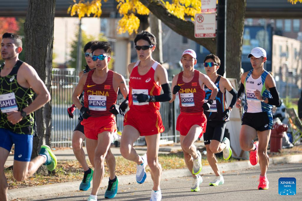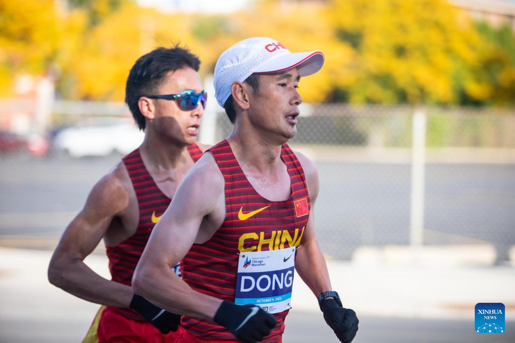 Dong Guojian (L) of China competes during the 44th Chicago Marathon in downtown Chicago, the United States, on Oct. 9, 2022. (Photo by Vincent D. Johnson/Xinhua)