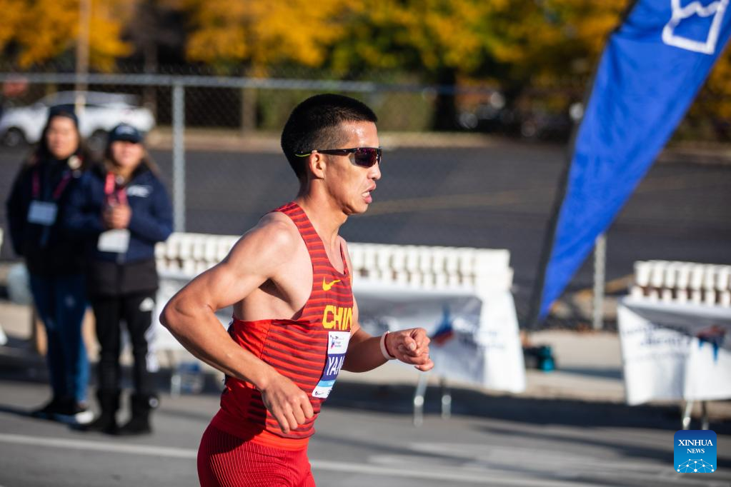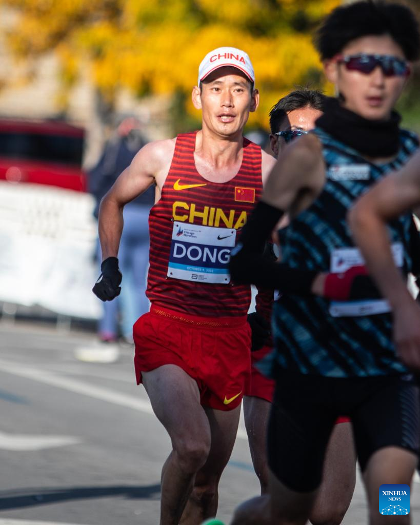 Yang Shaohui of China competes during the 44th Chicago Marathon in downtown Chicago, the United States, on Oct. 9, 2022. (Photo by Vincent D. Johnson/Xinhua)