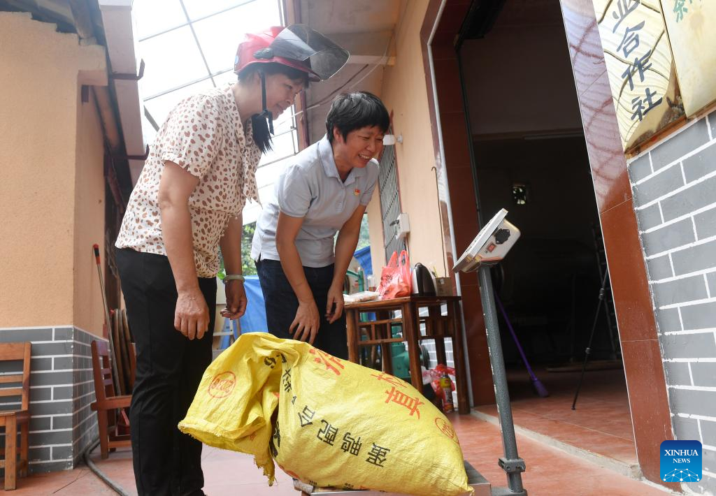 Zhu Xuelan (R) and a villager weigh a bag of newly-picked tea leaves in Shanping, a Yao ethnic village in Liubao, south China's Guangxi Zhuang Autonomous Region, Sept. 22, 2022. (Xinhua/Lu Boan)