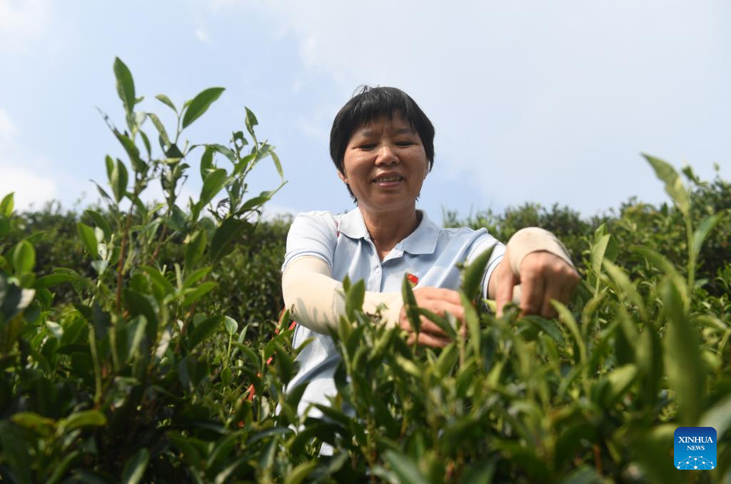 Zhu Xuelan picks tea leaves in Shanping, a Yao ethnic village in Liubao, south China's Guangxi Zhuang Autonomous Region, Sept. 22, 2022. (Xinhua/Lu Boan)