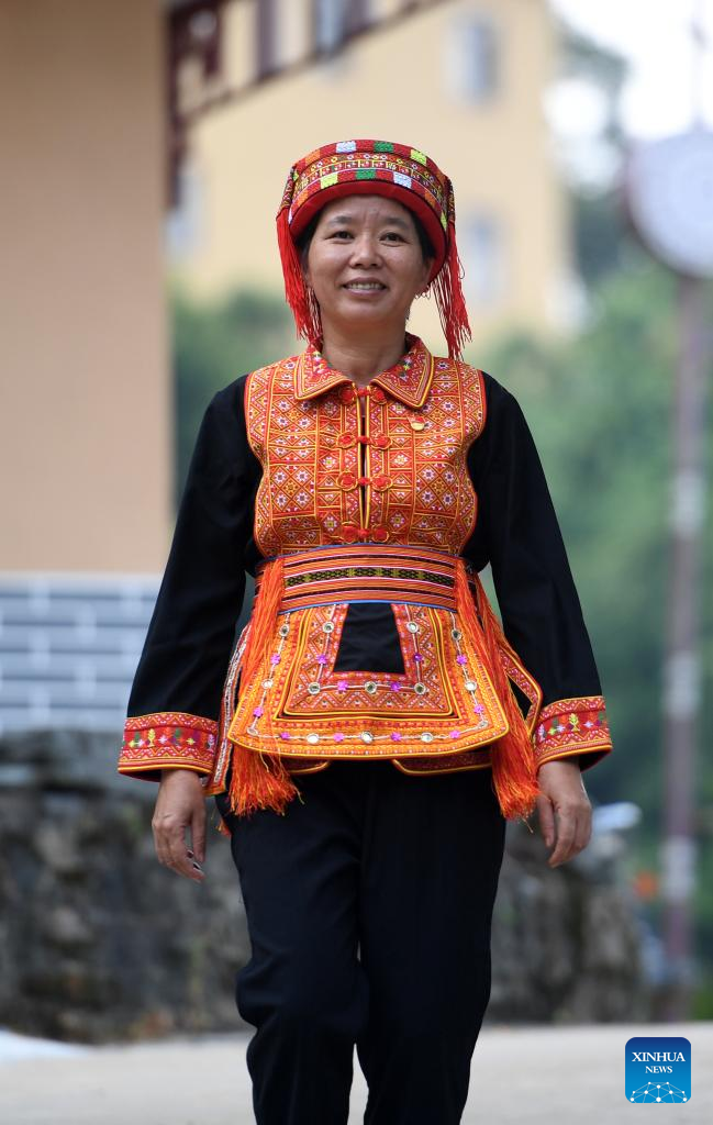Zhu Xuelan walks on a country road in Shanping, a Yao ethnic village in Liubao, south China's Guangxi Zhuang Autonomous Region, Sept. 22, 2022. (Xinhua/Lu Boan)