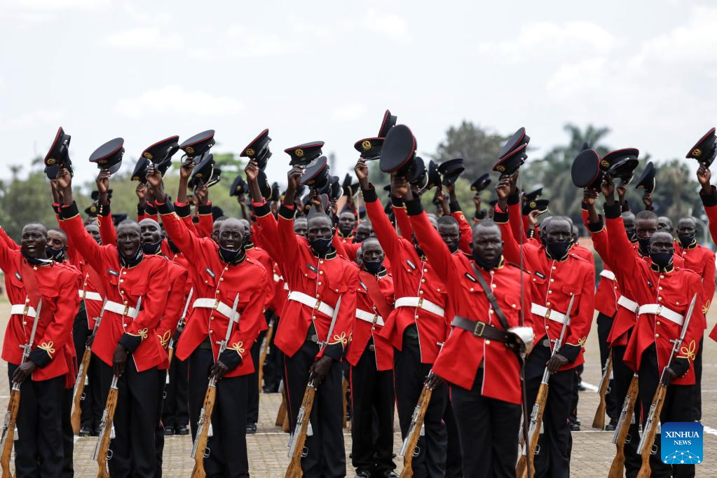 Officers and soldiers attend a celebration of the 60th anniversary of independence at the Kololo independence grounds in Kampala, Uganda, on Oct. 9, 2022. (Photo by Hajarah Nalwadda/Xinhua)