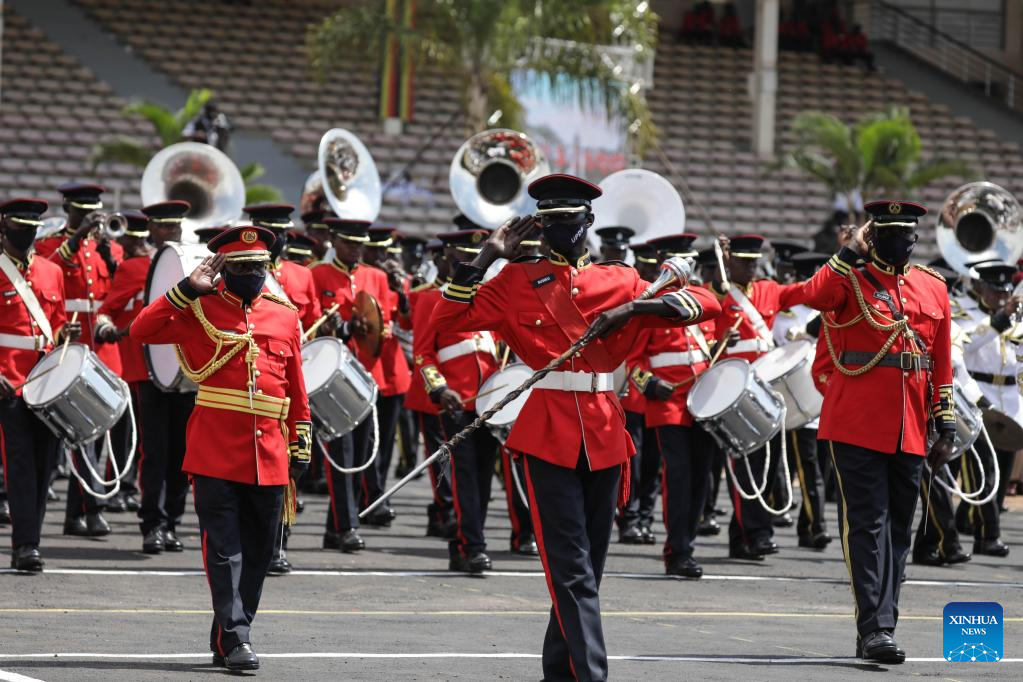 A military band performs during a celebration of the 60th anniversary of independence at the Kololo independence grounds in Kampala, Uganda, on Oct. 9, 2022. (Photo by Hajarah Nalwadda/Xinhua)