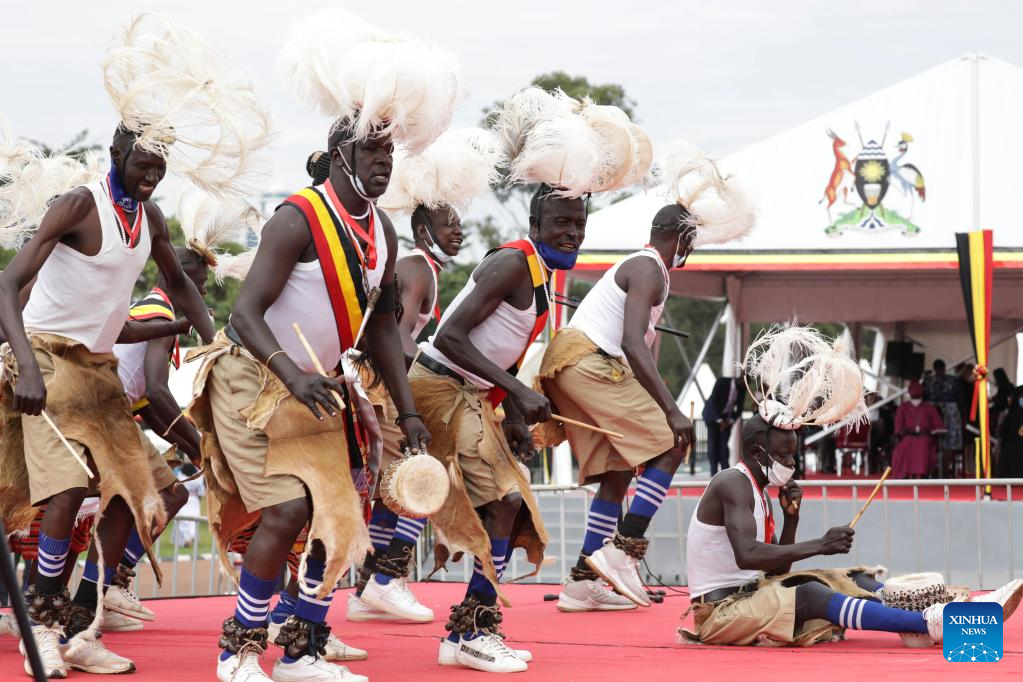 A dancing troupe performs during a celebration of the 60th anniversary of independence at the Kololo independence grounds in Kampala, Uganda, on Oct. 9, 2022. (Photo by Hajarah Nalwadda/Xinhua)