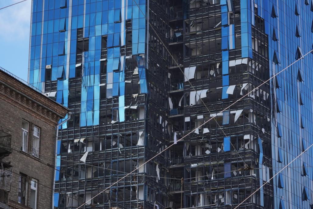 A damaged building is seen after explosions in Kiev, Ukraine, Oct. 10, 2022. (Photo by Roman Petushkov/Xinhua)