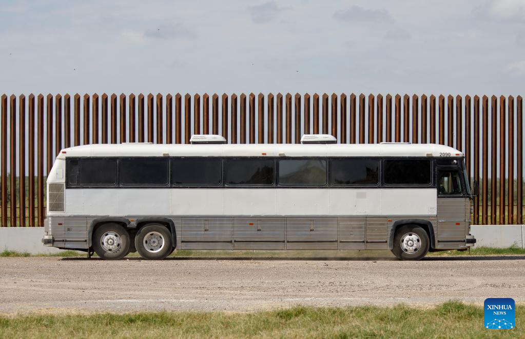 A bus carrying migrants drives along a portion of the border wall in Eagle Pass, Texas, the United States, on Oct. 10, 2022. Buses carrying migrants from Republican-led border states continue to arrive in liberal bastions like New York, Washington, D.C., and Chicago, dragging the U.S. migrant crisis into the eye of the storm of partisan battles ahead of the November midterm elections. (Photo by Nick Wagner/Xinhua)
