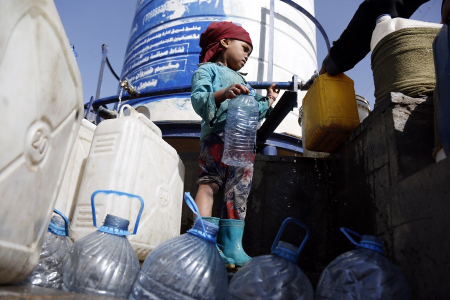 A child collects water at the Dharawan camp for internally displaced persons (IDPs) near Sanaa, Yemen, on March 25, 2022. (Photo by Mohammed Mohammed/Xinhua)