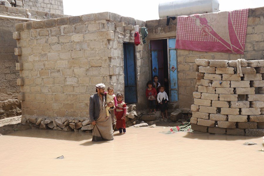 A man stands with his children outside their house surrounded by floods after heavy rains hit the Mabar District, Dhamar Province in Yemen on Aug. 23, 2022. (Photo by Mohammed Mohammed/Xinhua)