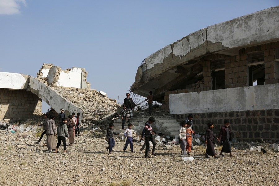 Yemeni students are seen at the destroyed Shuhada-Alwahdah school in Al-Radhmah district, Ibb province, western Yemen, on April 11, 2022. (Photo by Mohammed Mohammed/Xinhua)