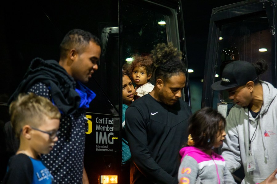 EAGLE PASS/HOUSTON, the United States, Oct. 11 (Xinhua) -- Buses carrying migrants from Republican-led border states continue to arrive in liberal bastions like New York, Washington, D.C., and Chicago, dragging the U.S. migrant crisis into the eye of the storm of partisan battles ahead of the November midterm elections.