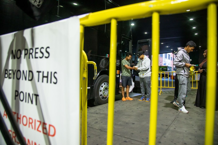 A migrant bus arrives at the Port Authority bus terminal in New York, the United States, on Sept. 27, 2022. (Photo by Michael Nagle/Xinhua)