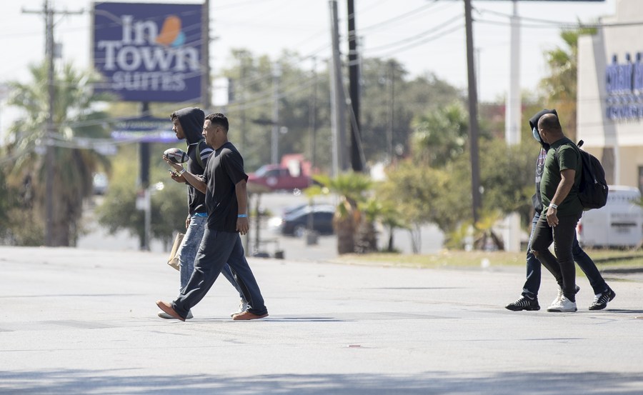 Migrants cross a street near a migrant resource center in San Antonio, Texas, the United States, on Sept. 30, 2022. (Photo by Nick Wagner/Xinhua)