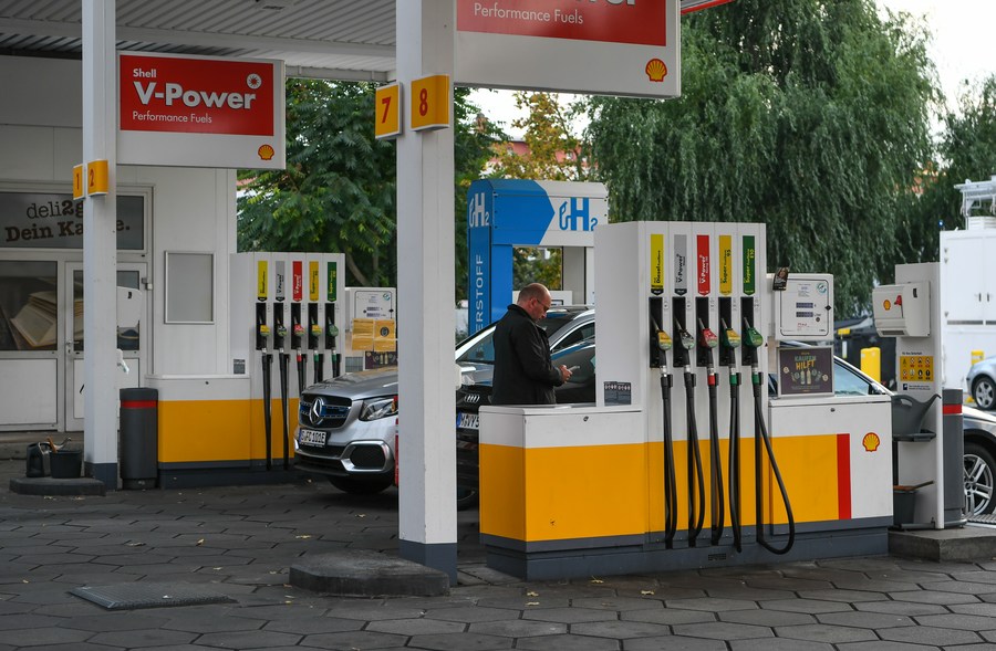 Photo taken on Oct. 8, 2021 shows a gas station in Frankfurt, Germany. Natural gas prices in Europe have been surging and hitting record highs as demand for fuel increases globally, spurring inflation fears and threatening to cripple major industries that are hoping to recover from COVID-19. (Xinhua/Lu Yang)