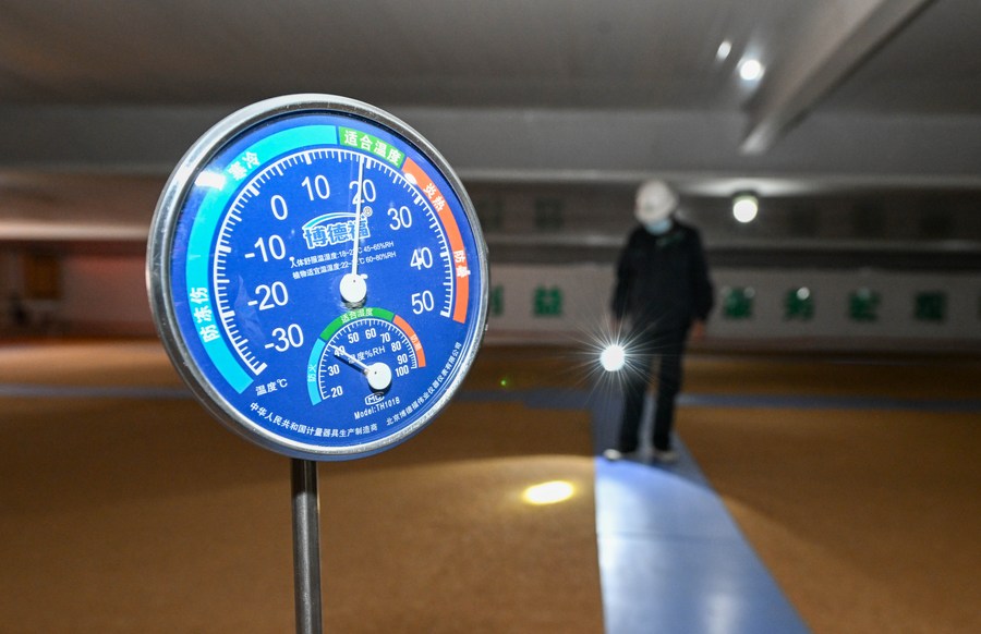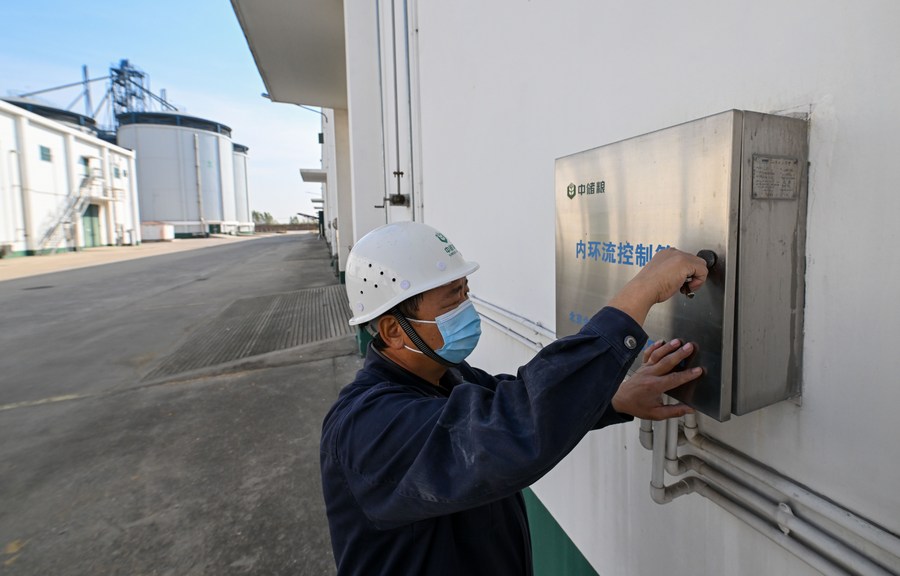 A staff worker adjusts temperature of the warehouse at Dongli branch of the Central Grain Reserve Tianjin Dongli Direct Warehouse Co., Ltd. in north China's Tianjin, Oct. 12, 2022. (Xinhua/Sun Fanyue)