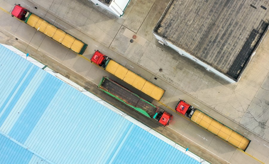 Aerial photo shows trucks loaded with grain at Dagang branch of the Central Grain Reserve Tianjin Dongli Direct Warehouse Co., Ltd. in north China's Tianjin, Oct. 12, 2022. (Xinhua/Sun Fanyue)