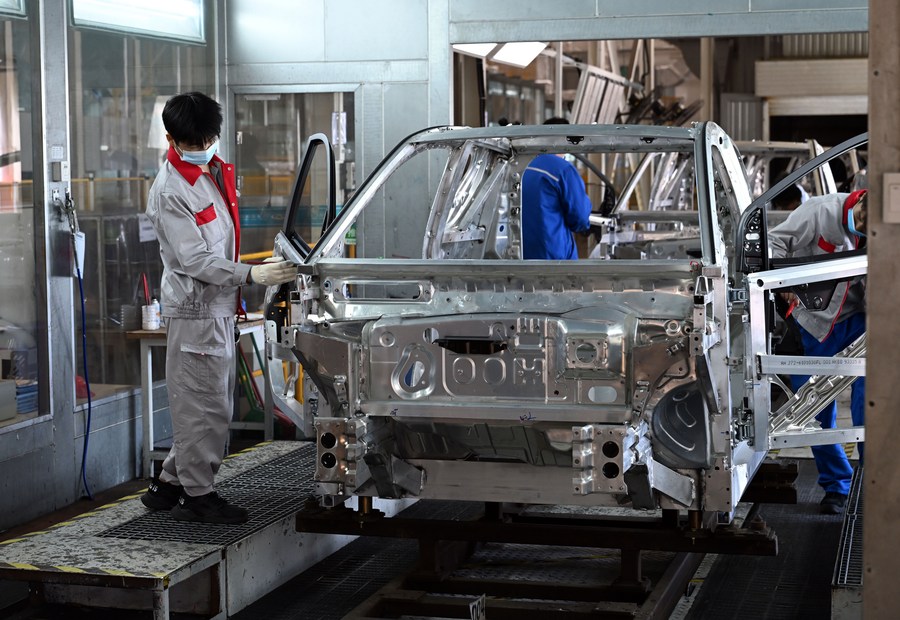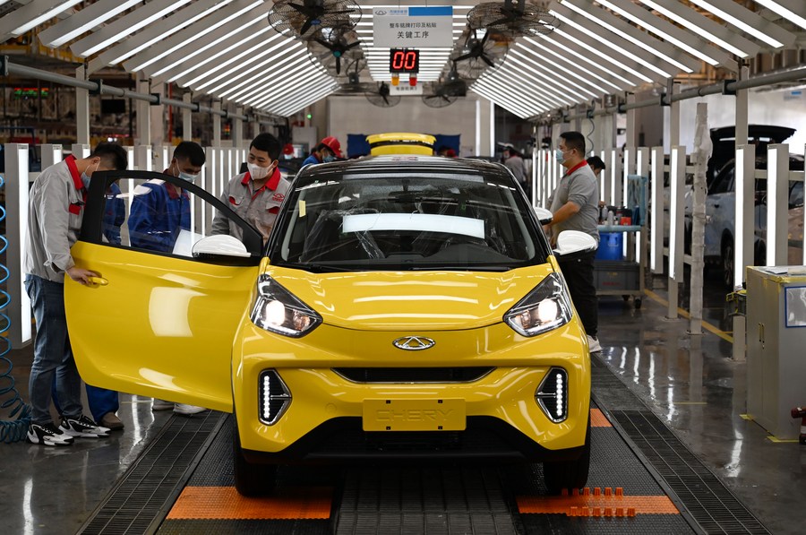 Workers are busy on a new energy vehicle production line at Chinese automaker Chery Holding Group Co., Ltd. in Wuhu, east China's Anhui Province, Oct. 12, 2022. (Xinhua/Zhou Mu)
