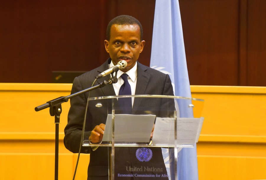 Antonio Pedro, acting executive secretary of the United Nations Economic Commission for Africa (UNECA), speaks during the groundbreaking ceremony of the UNECA's Africa Hall renovation project in Addis Ababa, Ethiopia, Oct. 14, 2022. (Xinhua/Michael Tewelde)