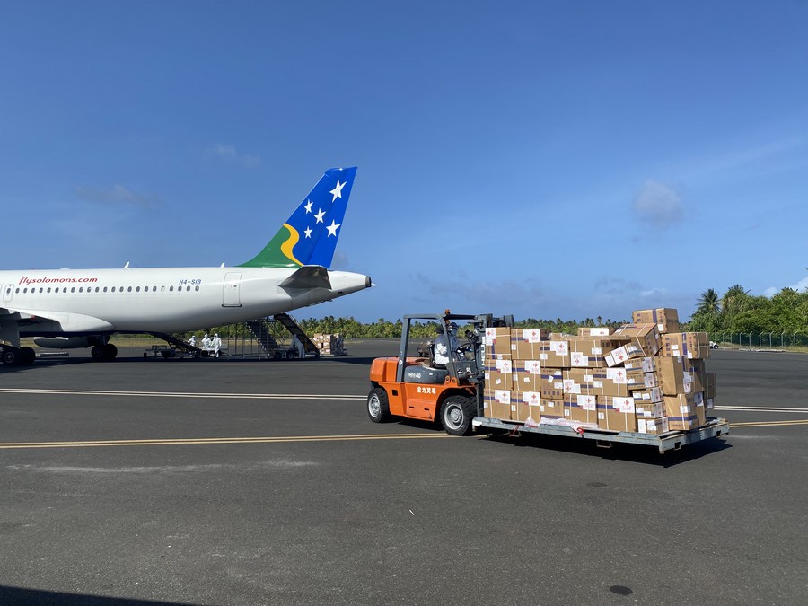 Anti-epidemic supplies provided by China arrive in Tarawa, Kiribati, Feb. 23, 2022. (Chinese Embassy in Kiribati/Handout via Xinhua)