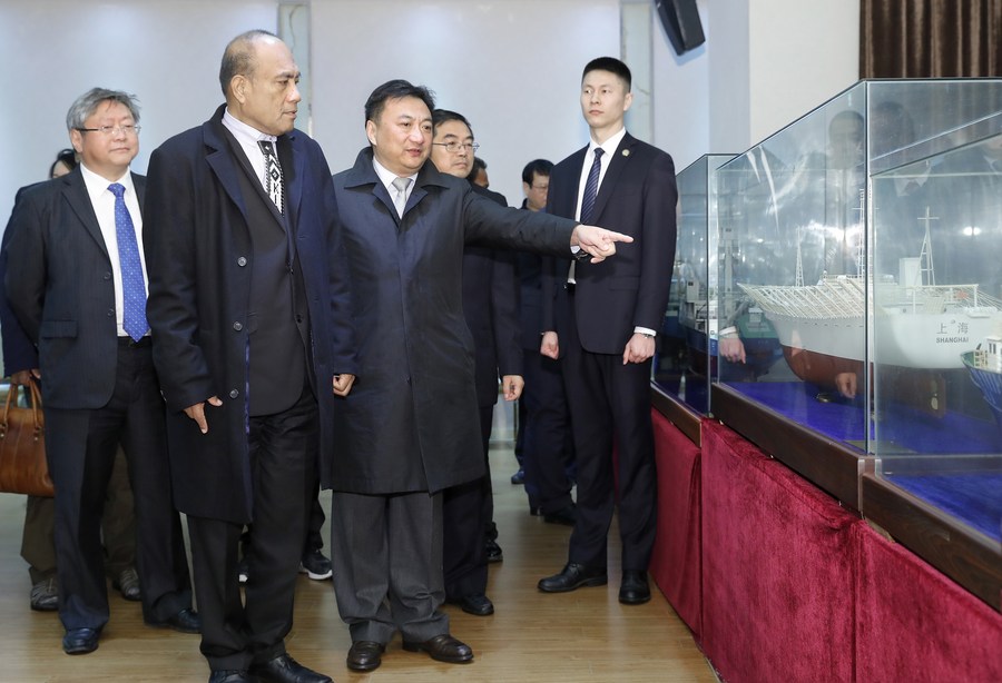 Kiribati President Taneti Maamau (L, front) listens to introduction of the fishing vessel models of Shanghai Fisheries Group in Shanghai, east China, Jan. 7, 2020. (Xinhua/Gao Feng)