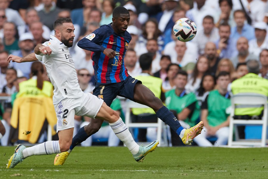 Daniel Carvajal (L) of Real Madrid competes with Ousmane Dembele of Barcelona during their La Liga match at the Santiago Bernabeu Stadium in Madrid on Oct. 16, 2022. (Xinhua/Meng Dingbo)